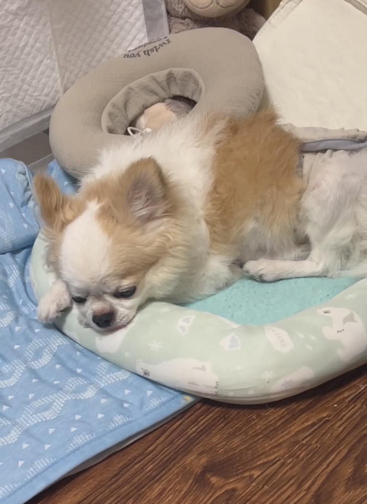 昨日の術前検査を終え、利尿剤とお薬2種類を休薬をして迎えた本日のニーノの様子です。
