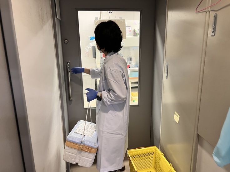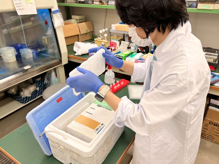 輸送にはメディカル専用の航空便を利用しています。「冷凍」ではなく「冷蔵」指定。処理せずに冷凍してしまうと細胞を増やすことが出来なくなるためです。
