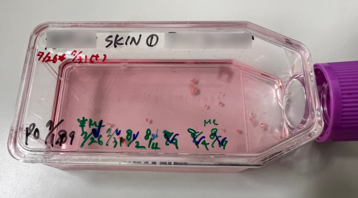シャーレボトルの中にぽつぽつと浮かぶのが、解剖によって取得された絶滅危惧種の組織。つまり、肉片です。