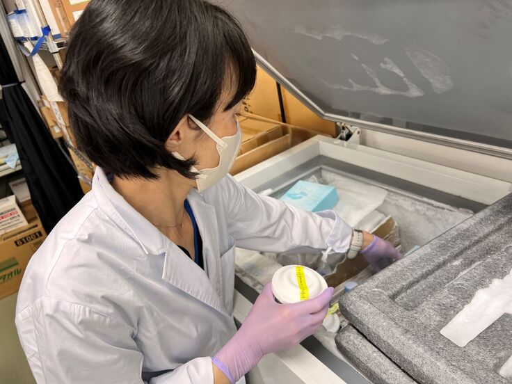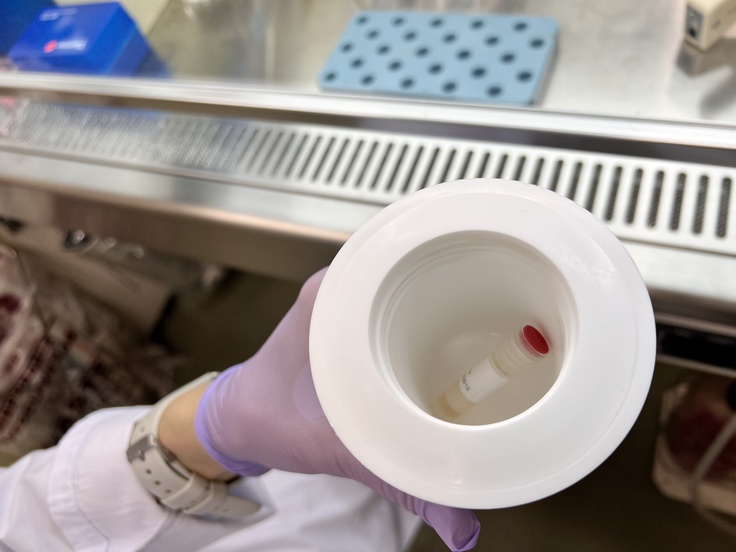 バイセルごとマイナス80度のディープフリーザへ。細胞保存タンクへ入る前処理がこれで完了です!