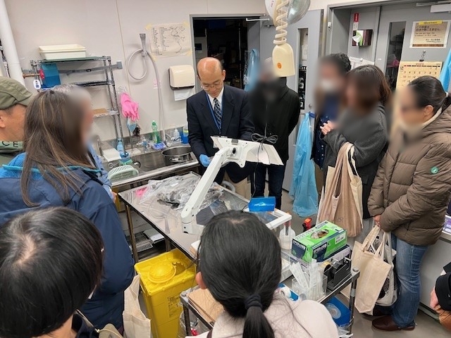 ここからは、通常は入れない「野生動物検疫施設」の中へ。全国から届く絶滅危惧種の死亡個体の検疫と保存用の解剖を行う施設です。実際の死亡個体(カンムリワシ、ヤンバルクイナ、ノグチゲラ)を防水袋越しにご覧いただきました。