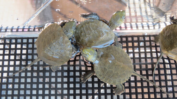 飼育場の陸場の一部に穴が開いていたので、もしかしたらと思い確認してみると500円玉ほどの大きさの子亀さんが全部で5匹生まれておりました。