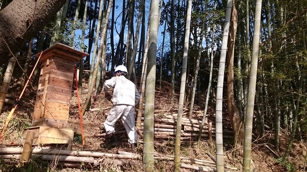 作業する横では季節はずれの暖かさでミツバチが飛び回ってます。