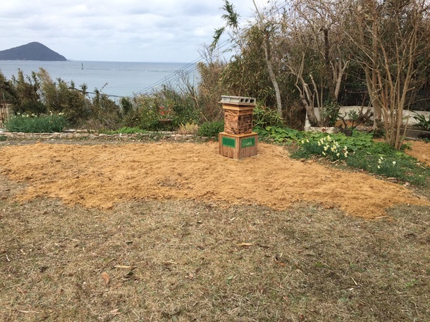 翌春の為に設置した巣箱周辺に地域のタケノコ竹林整備で発生した竹チップを防草用に散布しました。