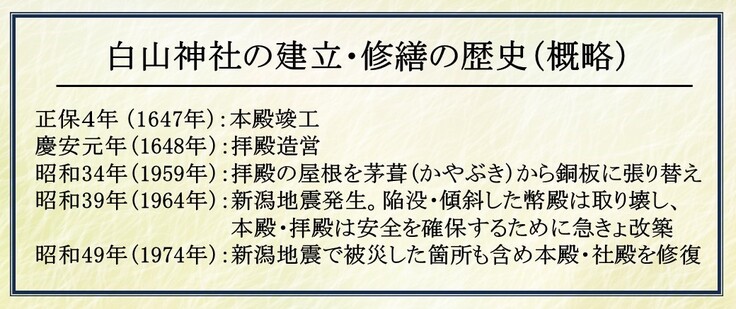 新潟地震から六十年が経過し、本殿を始めとする建造物も老朽化が目立ち、令和六年元日の能登半島地震による被害もわずかながらあり、これから先の五十年百年を見据えた御屋根の張り替え工事と整備事業を行う予定です。