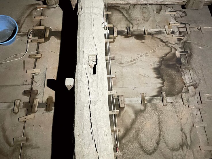 ▲屋根銅板に亀裂が入り雨漏りするよう屋根裏。現在はブルーシートを張って応急処置。