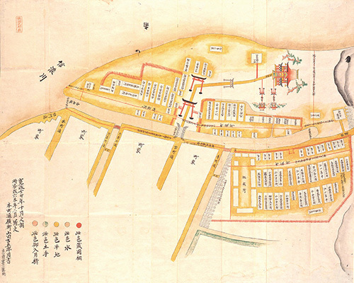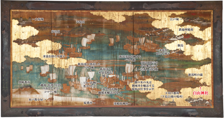 日本海や北海道の港から、江戸や大阪(大坂)への流通に大変重要な役割を果たしていた「北前船」。その船主より寛永5年(1852年)に年貢米輸送の安全と繁栄を祈願して、奉納された絵馬。当時の新潟湊での米の積み込みが精確に描かれた船絵馬で、貴重な資料として新潟県有形民俗文化財に指定されています。