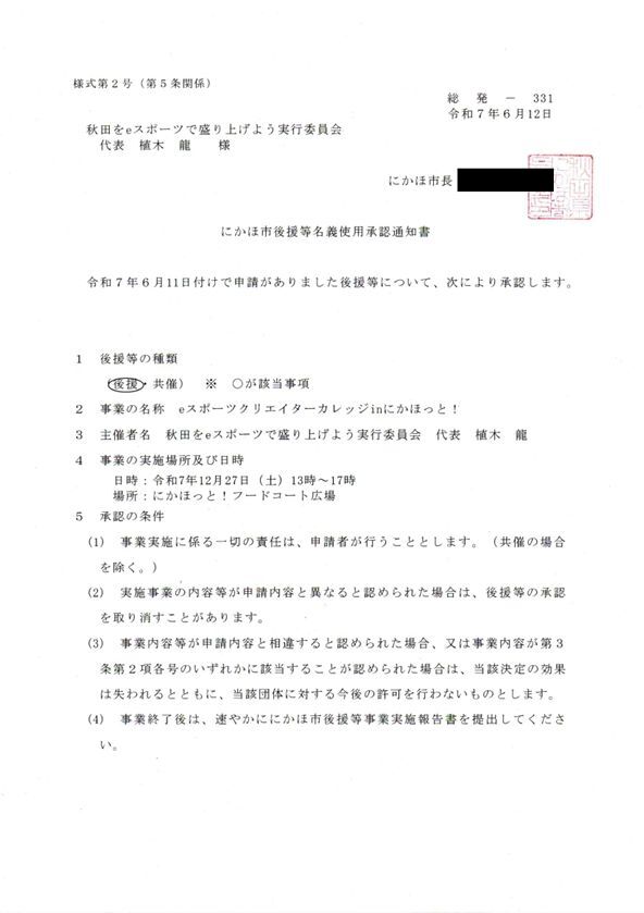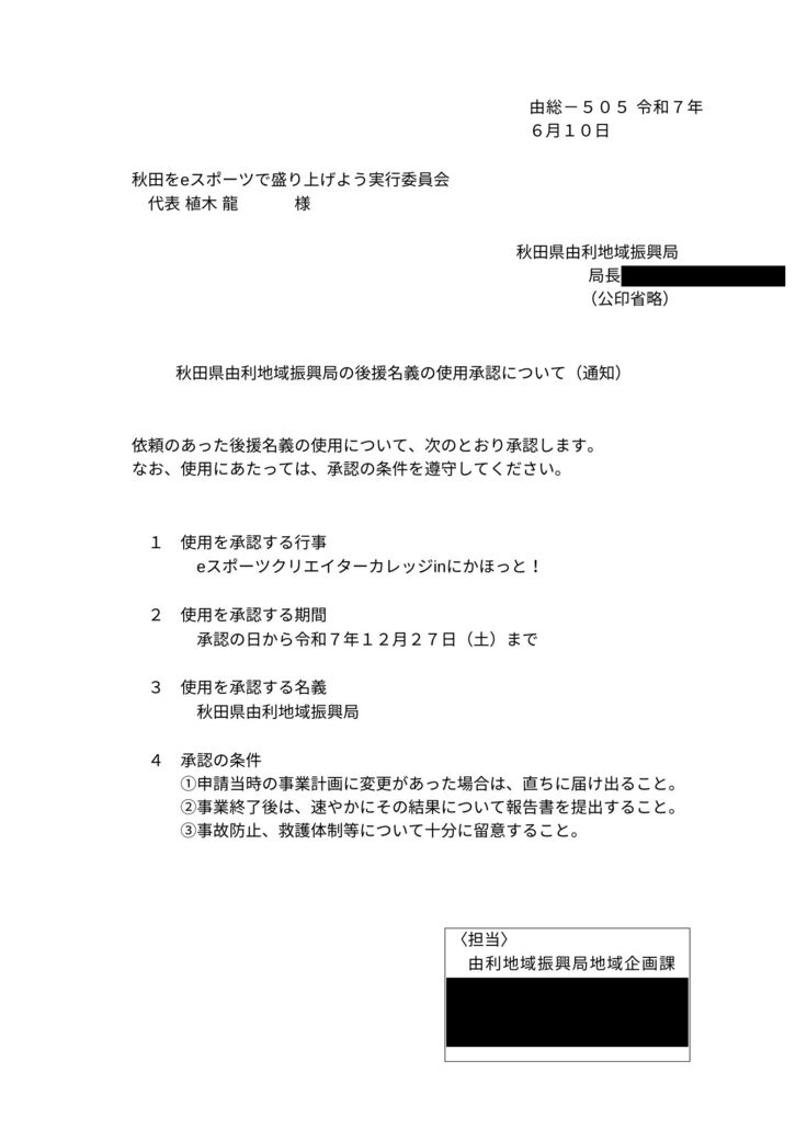 ※プロeスポーツチームVAMOS esportを運営する株式会社 GamingV様、秋田県由利地域振興局様、にかほ市長様からプロジェクトを行うこと、名称と画像掲載を行うことの許諾を取得しております。