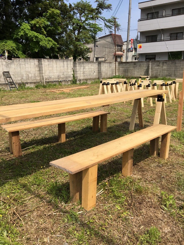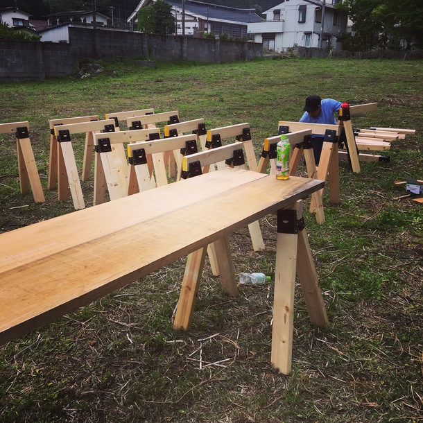 草刈りから始まり、テーブル作り、ベンチ作り、イルミネーションを飾る枠作りなどを行っています。