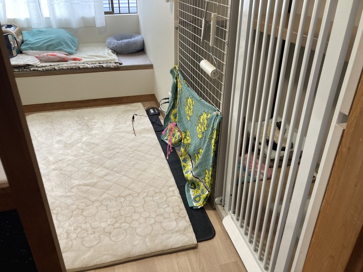 ☝2階隔離部屋①の様子 柵の中に高齢猫すずさんを保護中
