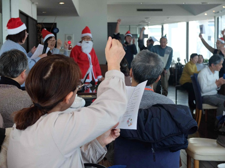 レストランでの交流会。クリスマスソングのピアノ演奏と合唱