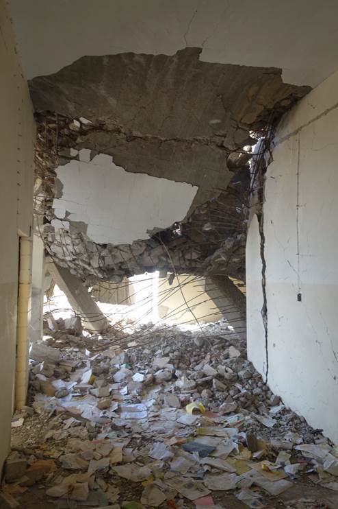 廊下の天井もコナゴナ。空爆の衝撃を物語っています。