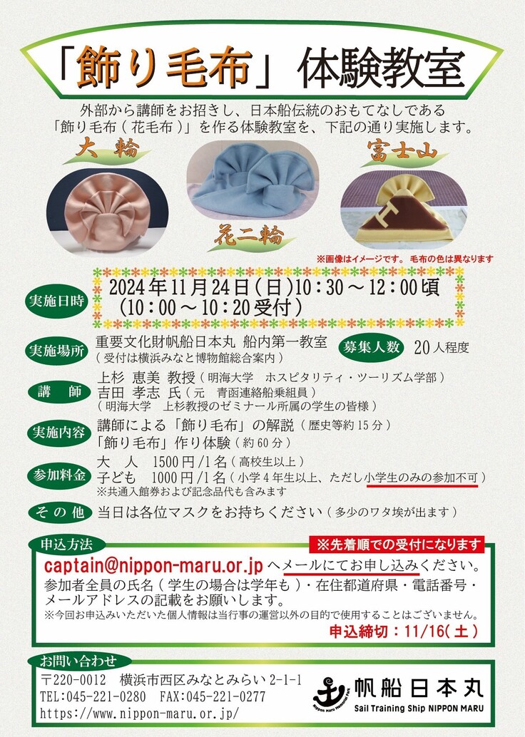 帆船日本丸船内で「飾り毛布」体験教室を実施します