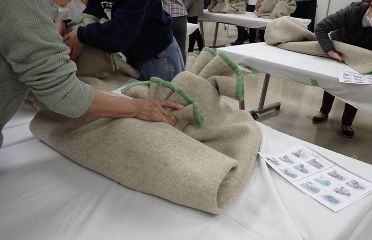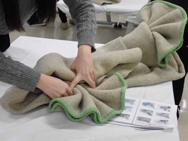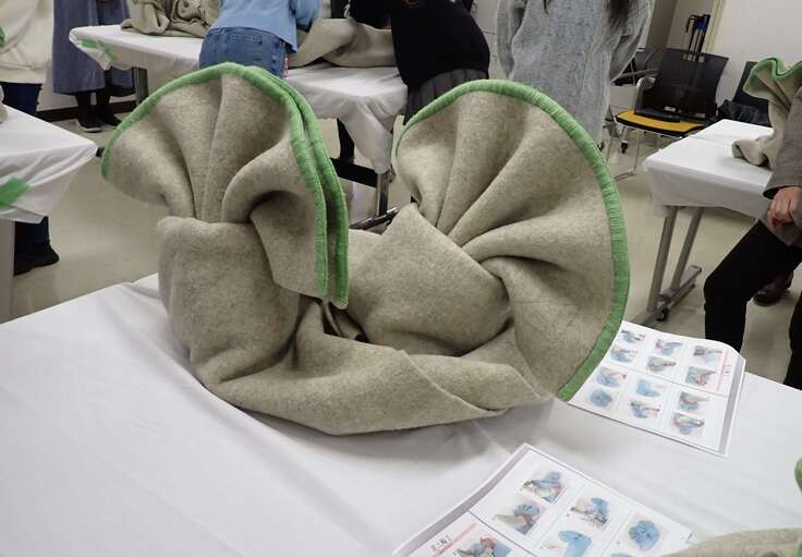 11月24日に「飾り毛布」の解説と体験会を実施しました。明海大学ホスピタリティ・ツーリズム学部のみなさまにご指導いただきました。ありがとうございます。参加者は約20名。参加されたみなさんは、「大輪」「富士山」「花二輪」の3種類の飾り毛布に挑戦しました。汗をかきながら、楽しそうに毛布を折りたたんでいました!「花二輪」制作の様子をご紹介します。
