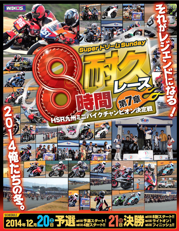 このレースはHSR九州本コース(1周2.4km)にて行われる排気量50ccの車両を使った実に8時間を走り切るミニバイクの耐久レースです。決勝戦では、90チームが走行し互いに競い合います。この90チームの中には多くの強敵がおり、それらのチームは皆総じてレース車両の完成度がかなり高いレベルになってきております。