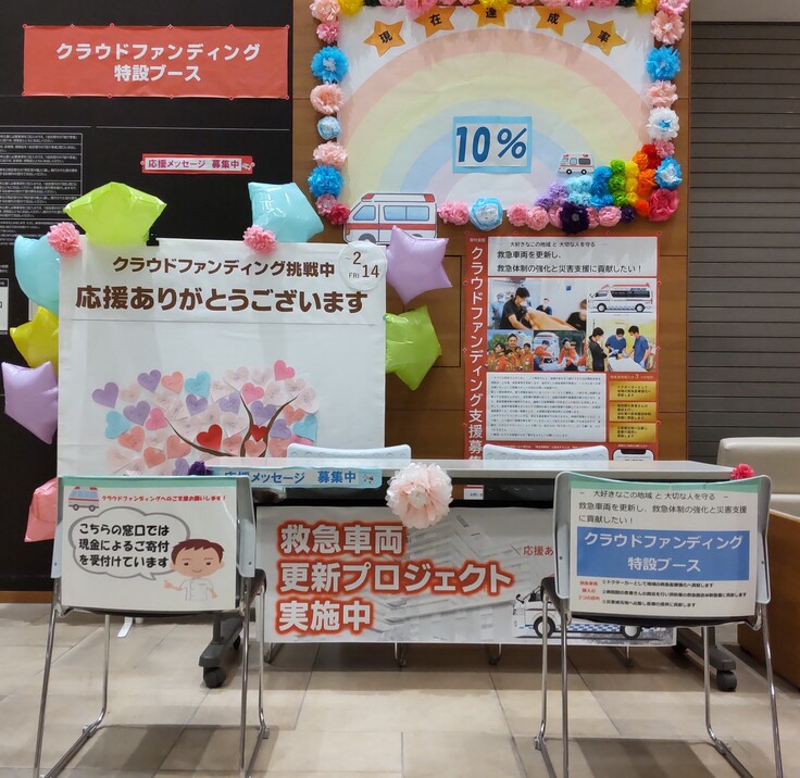 お手続きについては、病院の正面玄関エントランスホールに特設ブースを設置(平日8時30分~12時30分ごろ)していますので、現金を持参のうえ、窓口までお越しください。病院職員が寄付金をお預かりし、当院にてクラウドファンディングの手続きを代行いたします。窓口に職員が不在の場合は、近くの病院職員までお声がけください。