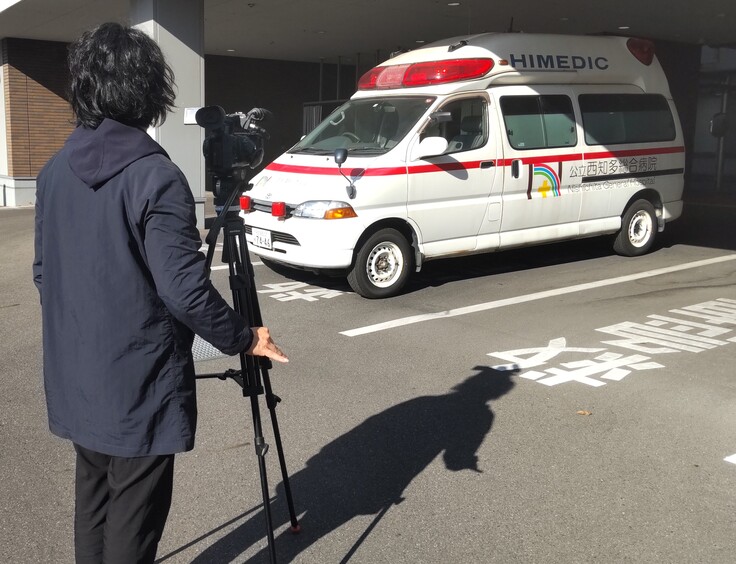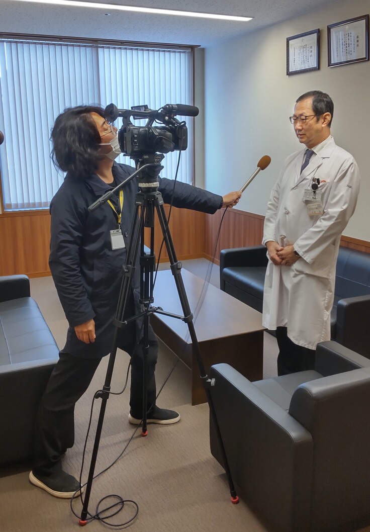 取材は、インタビュー形式で行われ、クラウドファンディングの概要、救急車両購入にあたり当院の現状と目的などについて、吉原院長、有木副院長兼救急診療センター長等によりご説明し、その後当院が現在使用している救急車両などをご案内しました。