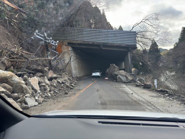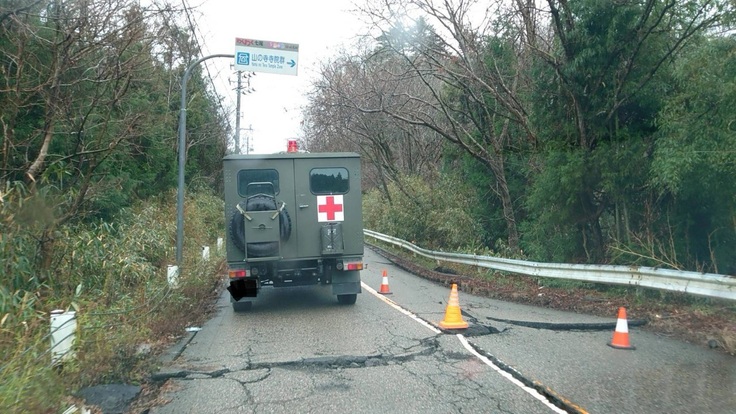 私たちの隊は輪島に派遣が決まりました。所々道路が寸断されているので自衛隊に先導され、危険な道を通常の3倍の時間をかけて進み、現地入りしました。日が沈むととても危険で通行することはできなくなります。輪島への道は、進むにつれ景色がどんどん悪くなっていき、被害の大きさを感じられました。