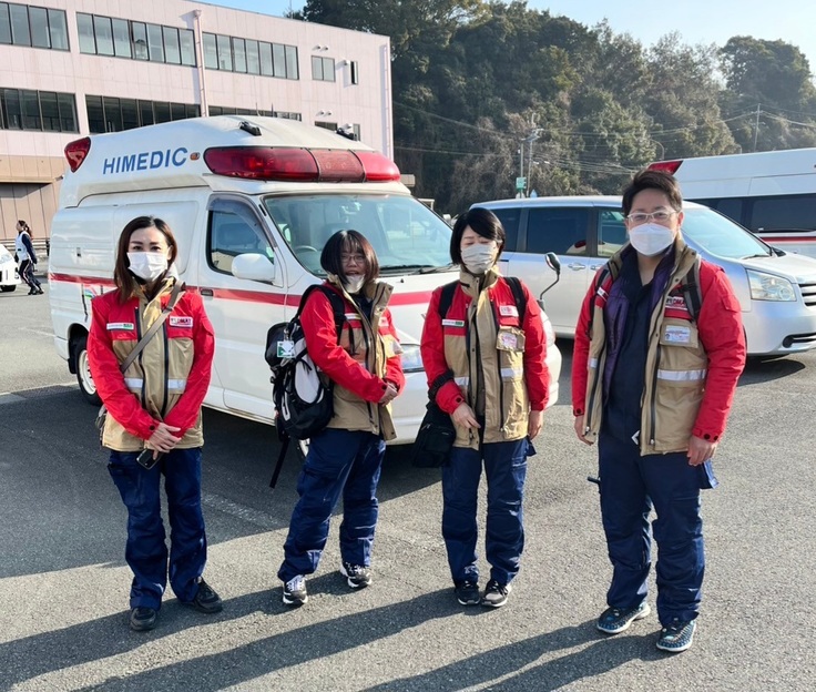今回は今もがんばってくれている当院の救急車で出動しました。この運転を伊勢市までしたのは女性隊員2人だとか。たくましい。