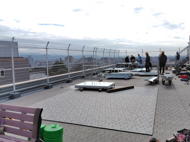 2月17日㈯にリハビリ施設の資材を屋上に上げて、組み立て工事を行っています。