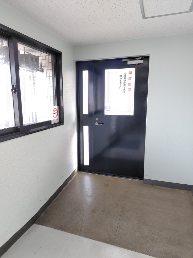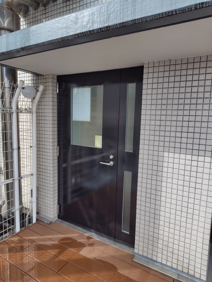 西館屋上に出る扉が古く重たい扉で老朽化している事や扉の開放の方向も変えて、車いすや歩行器でも屋上へ出やすいように、扉の改修工事を行いました。