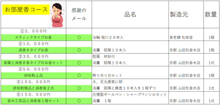 特にお部屋香コースは京都香老舗の逸品に特化したコース、スペシャルコースは西川らしいオリジナリティあふれるコースにお仕立てしました!
