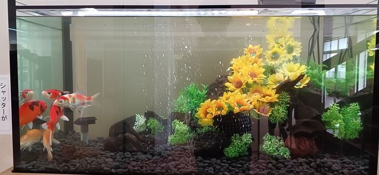 【桃山小学校へ設置中の水槽】水槽内にはきれいな向日葵が咲いています。