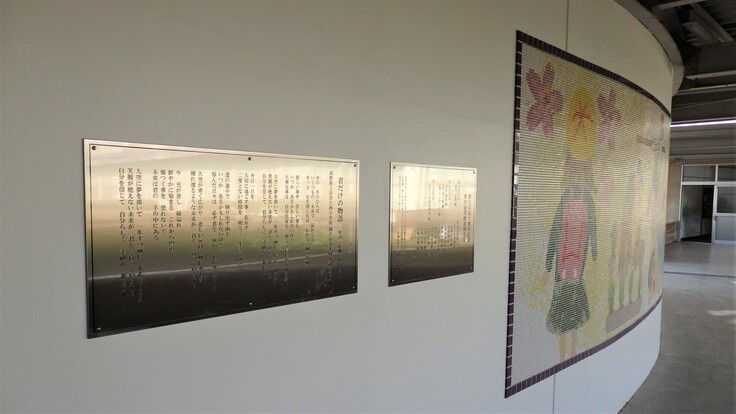 タイル壁画横の銘板には5万円以上ご寄付をいただいた方の中で、ご希望のあった方のお名前を掲載させていただきました。その横には記念曲「君だけの物語」の歌詞もプレートにして残しました。