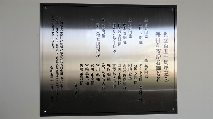 こちらが寄付をいただいた方のお名前を掲載した銘板です。クラウドファンディングだけでなく直接ご寄付いただいた地域の方のお名前も掲載しています。