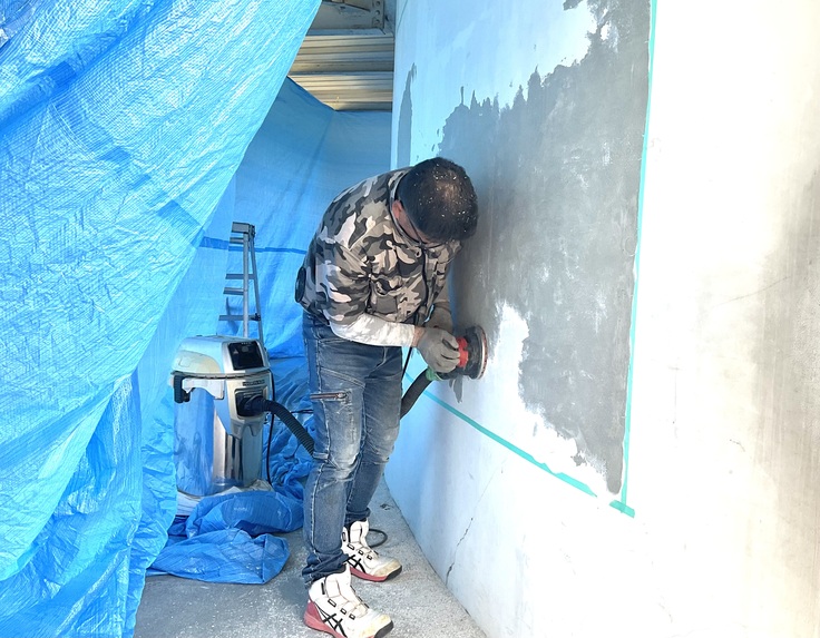 西小学校も夏休みに入りました。7月28日(金)からタイル壁画の設置作業が始まりました。この日は、タイルを設置する壁の塗装を剥がす作業でした。暑い中、業者の方が丁寧に作業してくださいました。8月1日(火)からは、いよいよタイルの貼り付け作業が始まります。