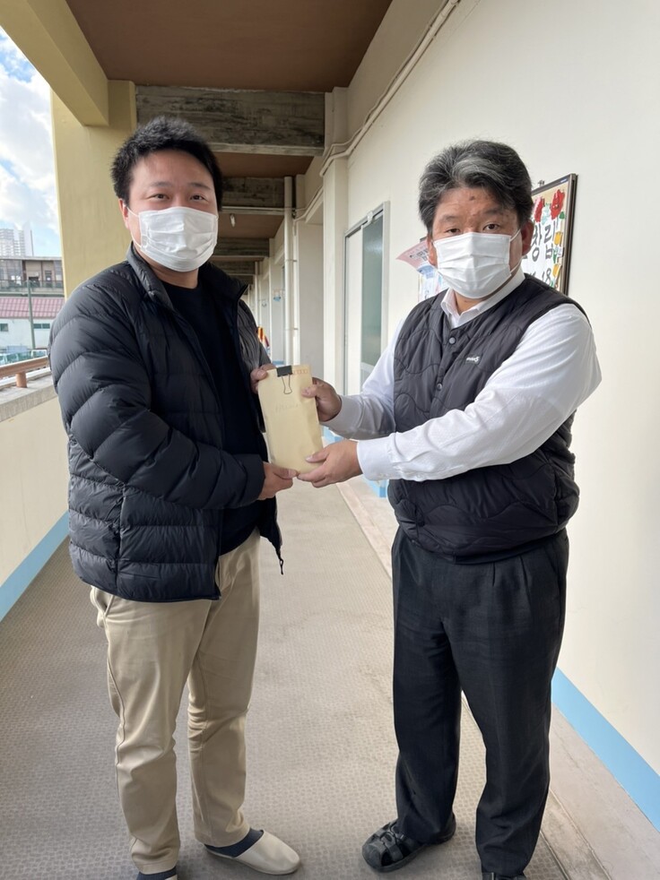 コンペ翌日、多くの方々からいただきましたチャリティー基金を、西神戸青商会会長が学校長に贈呈しました。