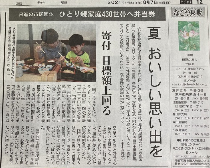 そして、7月22日には日進市の近藤市長にお弁当券の目録(345家族・1380食分)をお届けし、27日には社会福祉協議会様からひとり親家庭にお弁当券を発送いただきました。