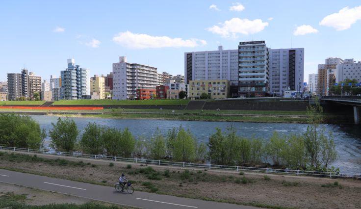 豊平川:新渡戸もこの川を何度も訪れました。当時はこの川べりに貧しい人たちが住んでいたそうです。この手前に夜学校が建てられました。道を横断して、そして夜学校に学びに通っていたのでしょう。