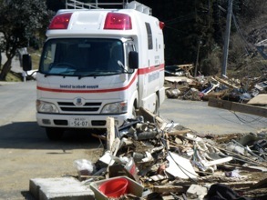 さらに、発災2時間後の3月11日16時40分、高度救命救急センター医師を中心に(医師3名、救急救命士1名)日本DMATとして多目的医療支援車で東北自動車道を北上し日本DMATの集結地である仙台医療センターに向かいました。