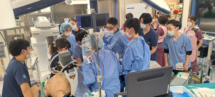 これは救命救急科(CCM)と心臓血管集中治療科(CCU)との合同トレーニングの一風景です。