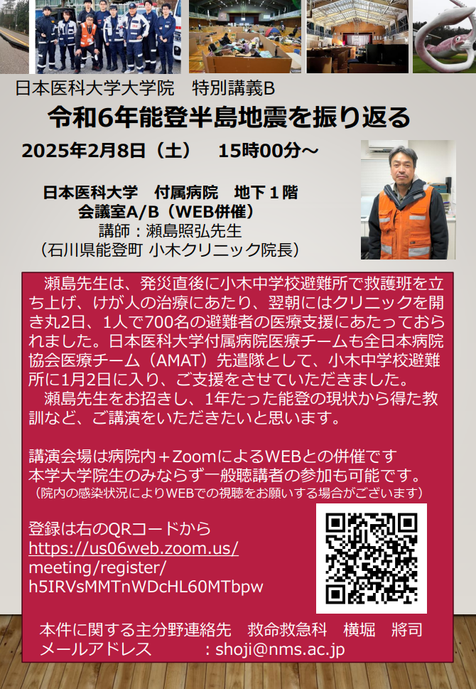 日本医科大学付属病院医療チームもAMAT先遣隊として、小木中学校避難所に1月2日に入り、ご支援をさせていただきました。災害医療のリアルや、1年たった能登の現状から得た教訓など、ご講演をいただきたいと思います。