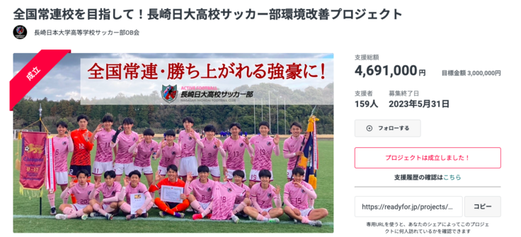 長崎日大高校サッカー部OB会主催による、初めての企画「クラウドファンディング」でしたが、支援者の皆様、多くの関係者の皆様のお陰様をもちまして、第一目標だけではなく、その先の、第二目標金額までを達成することができました。本当にありがとうございました。