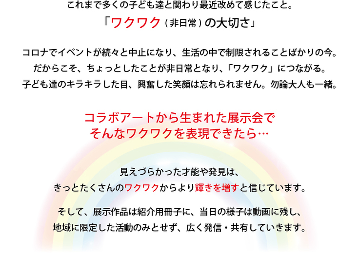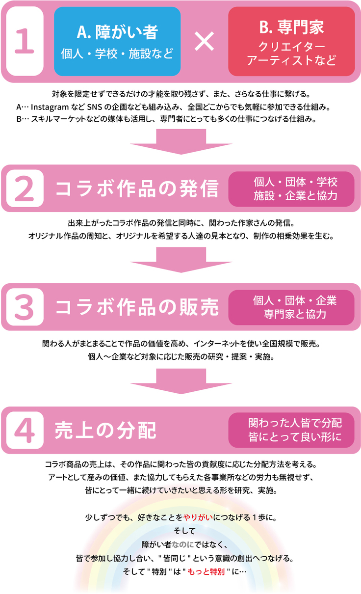 誰もが繋がる、境界のない社会へ。 子どもや障がいのある人達を中心に、より多く広い世代や環境に対して、イベントなど個人や団体が繋がる取り組みを促進する事業を行い、子ども達の平等な教育環境と、ボーダレスに向けた意識づくりに寄与することを目的としています。そして、多くの人を巻き込み知り合う経験の中から一人一人の持つ世界を広げ、人の痛みを知ることで想いやりあふれる子ども達の健全育成と明るい未来へ繋ぎ、持続可能な開発目標(SDGs)としていかに取り組めるかを考えます。 今回は「イベント総合部会」「ビジネス促進部会」「コラボ促進部会」に分かれた3つの部会から「ビジスネ促進部会」を中心に、障がいがあってもなくてもより多くの皆が同じように自信や仕事に繋がる仕組みづくりとして1歩となる展示会開催に向け、皆で協力して取り組みます。