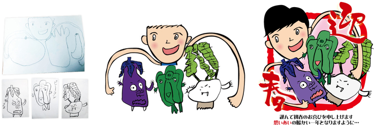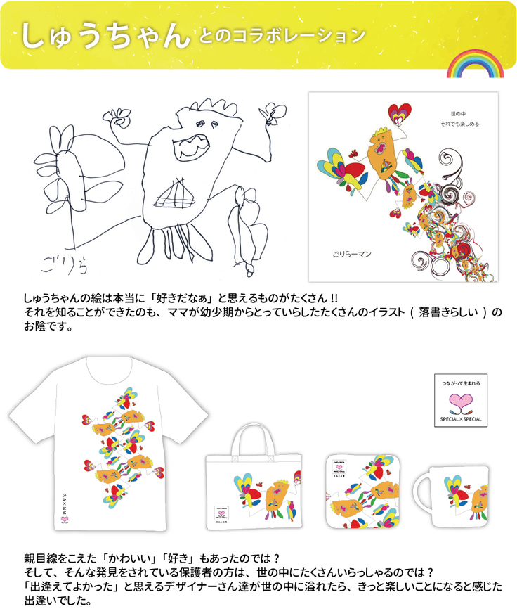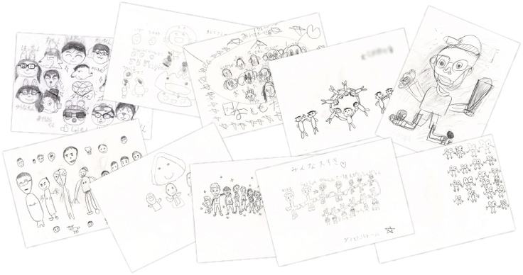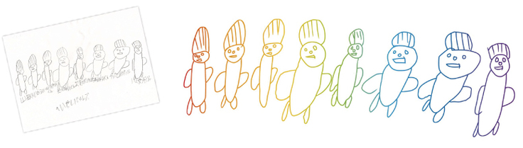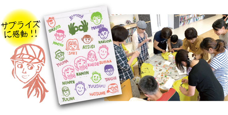 皆の新たな可能性を感じ始めたのは、24時間テレビ出演が決まり、ご家族皆で協力して衣装をアレンジしてくださった時。直接押した手作りスタンプは、メンバー自身が描いた自画像が元になっています。イラストの可能性を知るきっかけとなりました。