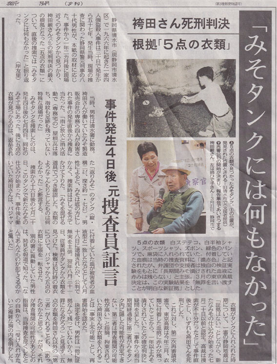 下は6月30日の東京新聞(夕刊)です。事件当時、捜査員の1人だった元刑事の80代男性が「(犯行着衣が出てきたとされる)味噌タンクには何もなかった」と証言しているとのこと。この証言は初めて知りました。捜査に全力を尽くした1人としては、捜査機関が衣類を味噌タンクに仕込んだ可能性は受け入れがたい、と思っているそうです。そりゃそうだ。警察官だって警察がそんなことするはずがないと、思いたいもの。しかし、血染めの犯行着衣を味噌タンクに仕込ませることができたのは、捜査機関以外にはあり得ない。1日も早い無罪を!!