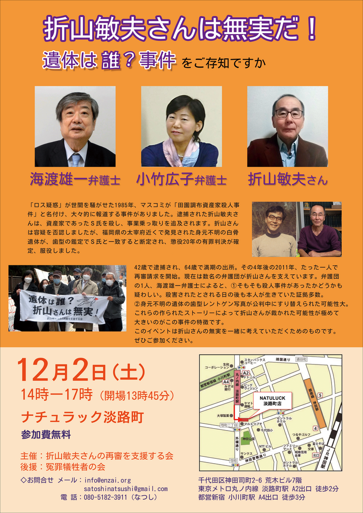 12/2(土)に開催した「折山敏夫さんは無実だ! 遺体は誰?折山事件をご存知ですか」と題したイベントの告知を兼ねて、折山敏夫さんへのインタビューを交えて放送しました。
