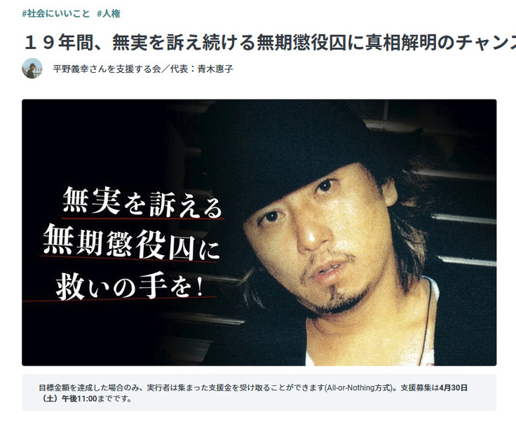 (大地義行の名で俳優としても活躍していた平野義幸さんは放火殺人犯として服役中。※下の写真はクラウドファンディングを行ったときの画像。残念ながら目標達成しなかった。)