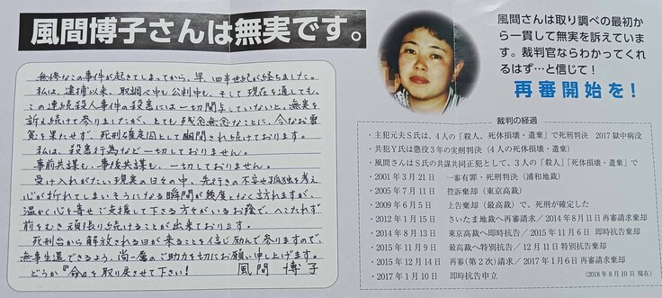 1993年、埼玉県熊谷市内でKさん、Eさん、Wさんが殺害されました。殺したのは犬猫繁殖販売業を営むS。そして一時期、Sと婚姻関係にあった風間博子さんも共謀共同正犯として逮捕されます。一貫して無罪を訴えてきましたが判決は死刑。現在も死刑囚として東京拘置所に収監されています。Sはその後、獄中で病死。博子さんは殺害の現場を見せられ、恐怖で支配されていたため通報もできず、Sに怯える毎日。そしてその結果、死体損壊・遺棄を手伝わざるを得ない羽目になります。
