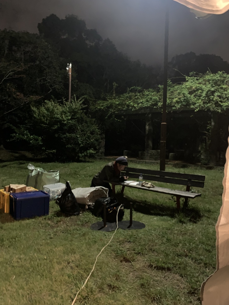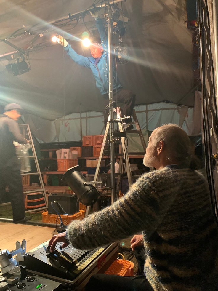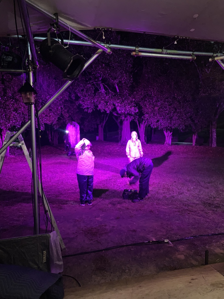 雨は本降りになり、カッパを着ての照明位置調整・確認。