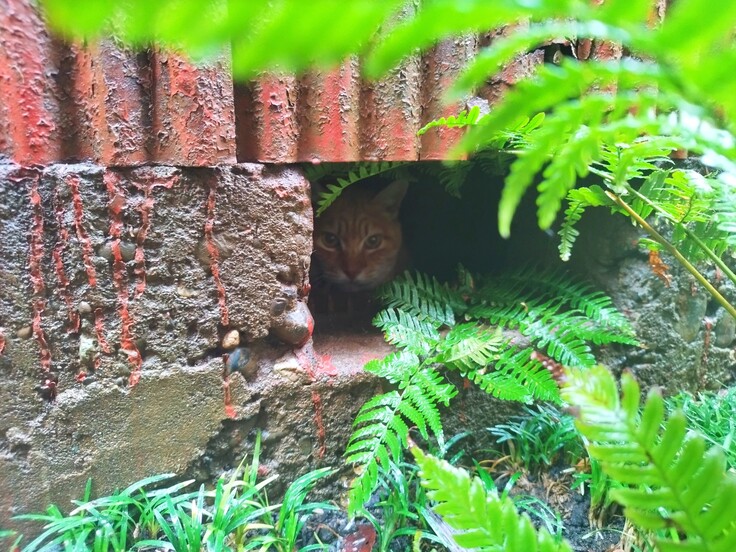 雪の降った日、近所の建物下で寒さをしのぐトラちゃん