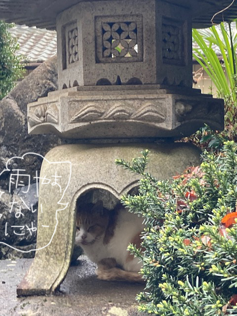 灯篭の下で雨宿りのチャロくんを見つけました。