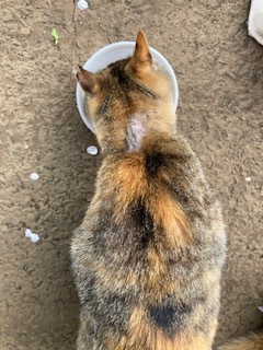 写真のミケちゃんの首の辺り、毛がない箇所が広がり、またかき傷もあります。