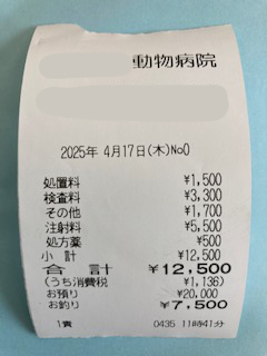 チャロくんの病院代は、処置代、検査代、鎮静剤やコンベニアなどの注射、駆虫薬代、ステロイド薬