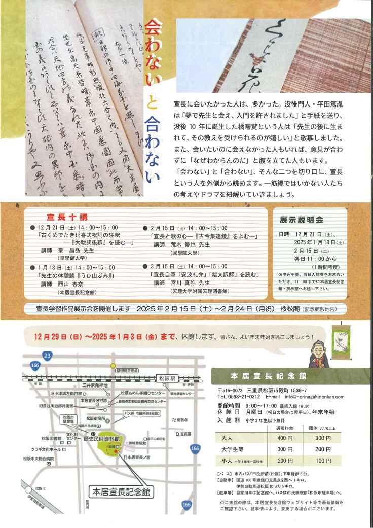 「会わない」と「合わない」、そんな二つの視点を切り口に、宣長という人を外側から眺めてみる展示をぜひお楽しみにしてください。