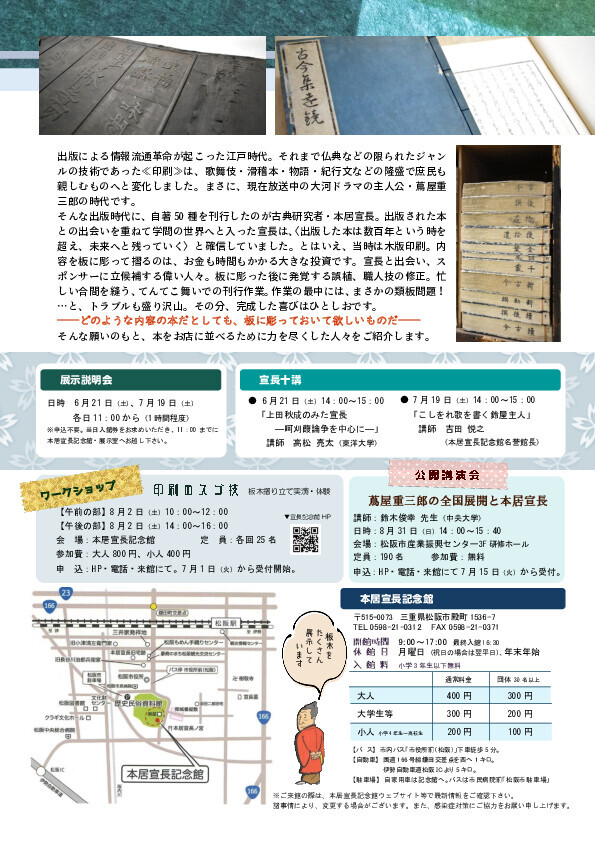 現在、夏の企画展「本がお店に並ぶまで」を開催しています。~どのような内容の本だとしても板に彫っておいて欲しいものだ~そんな願いのもと、本をお店に並べるために力を尽くした人々を紹介します。ぜひご来館ください。